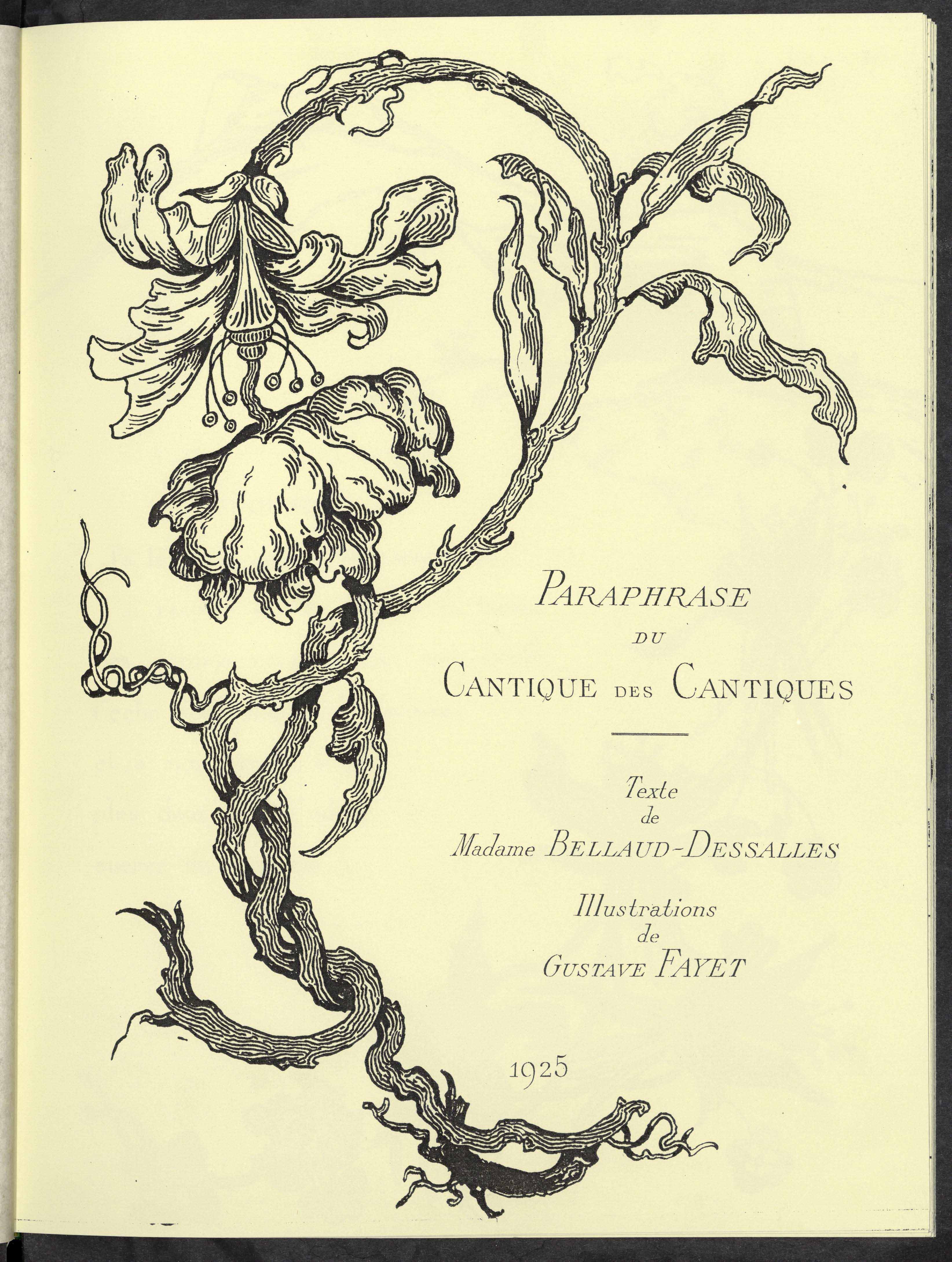 Passionné de littérature et bibliophile, Gustave Fayet illustre par des ornementations Les Fleurs du mal, des poèmes indiens, le Cantique des Cantiques… L’ouvrage Fleurs qu’il réalise en 1925, l’année de sa disparition, est un herbier imaginaire et testamentaire, dédié à ses petits-enfants : « Ici ce n’est que rêve et fantaisie – c’est le jardin des bonnes fées, où les plantes sont heureuses et toujours parées des plus harmonieuses couleurs ; où elles vivent éternellement. » Il encourage les enfants à la créativité et leur explique que faire une tâche sur un cahier d’écolier, ce n’est pas grave, car d’une tâche peut naître le merveilleux.