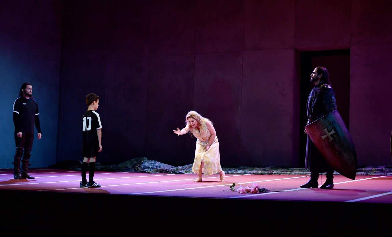 Adapté d’un célèbre épisode de La Jérusalem délivrée (1581) du Tasse (1544-1595), Armida nécessite une virtuosité vocale de la part de l’interprète féminine et des chanteurs. Karine Deshayes s’illustre dans le personnage vocal qui exige des extrêmes aigus et graves, et une énergie exemplaire ! La cantatrice affectionne Rossini à qui elle a consacré un album. Son talent d’artiste lyrique a été couronné à deux reprises par les Victoires de la Musique. A l’Opéra Comédie, elle partage la scène, transformée en stade olympique, avec le Chœur et cinq ténors, sous la direction de Michele Gamba. L’étoile montante de l’art lyrique, Enea Scala, dans le rôle de l’amant Rinaldo, est très présent et nous assistons à de nombreux duos. La thématique s’inscrit dans l’orientalisme très en vogue, et dévoile, au temps de la Première Croisade (1095-1099), les amours contrariés entre Armida, une magicienne musulmane, et Rinaldo, un chevalier chrétien qui lui préfèrera son devoir.