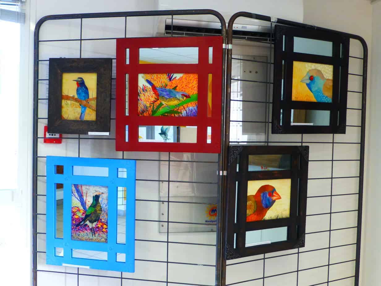 C’est dans cette mise en scène que le visiteur est accueilli par des oiseaux au plumage coloré et à l’œil vif. Alain Angé s’appuie sur la technique de la peinture sur verre dont l’origine est indienne. Il a d’ailleurs vécu en Inde et au Pakistan et a gardé en mémoire les « miniatures », ces petits tableaux colorés intégrés dans des meubles.